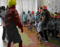 このあと部屋に戻って「豆まき」。鬼に扮した男性の保育士さんが登場すると豆鉄砲。「鬼は外」「福は内」と豆を放った。鬼が発する「 ウォー」の声に泣き出す園児も。「いい子になります」「お母さんのいうことを聞きます」 。 鬼もこの言葉に園児の頭をなぜて退散した。